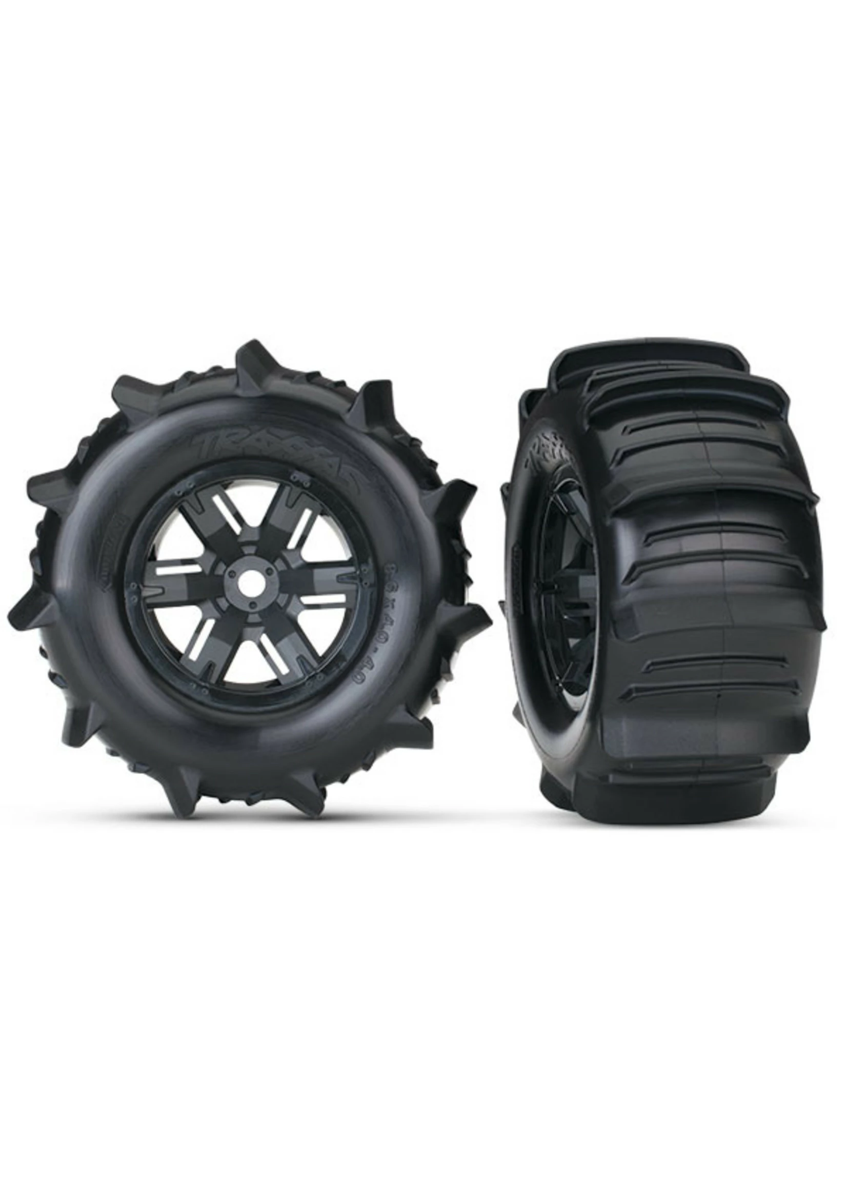 Includes: Tires & wheels, assembled, glued (X-Maxx® black wheels, paddle tires, foam inserts) (left & right) (2)