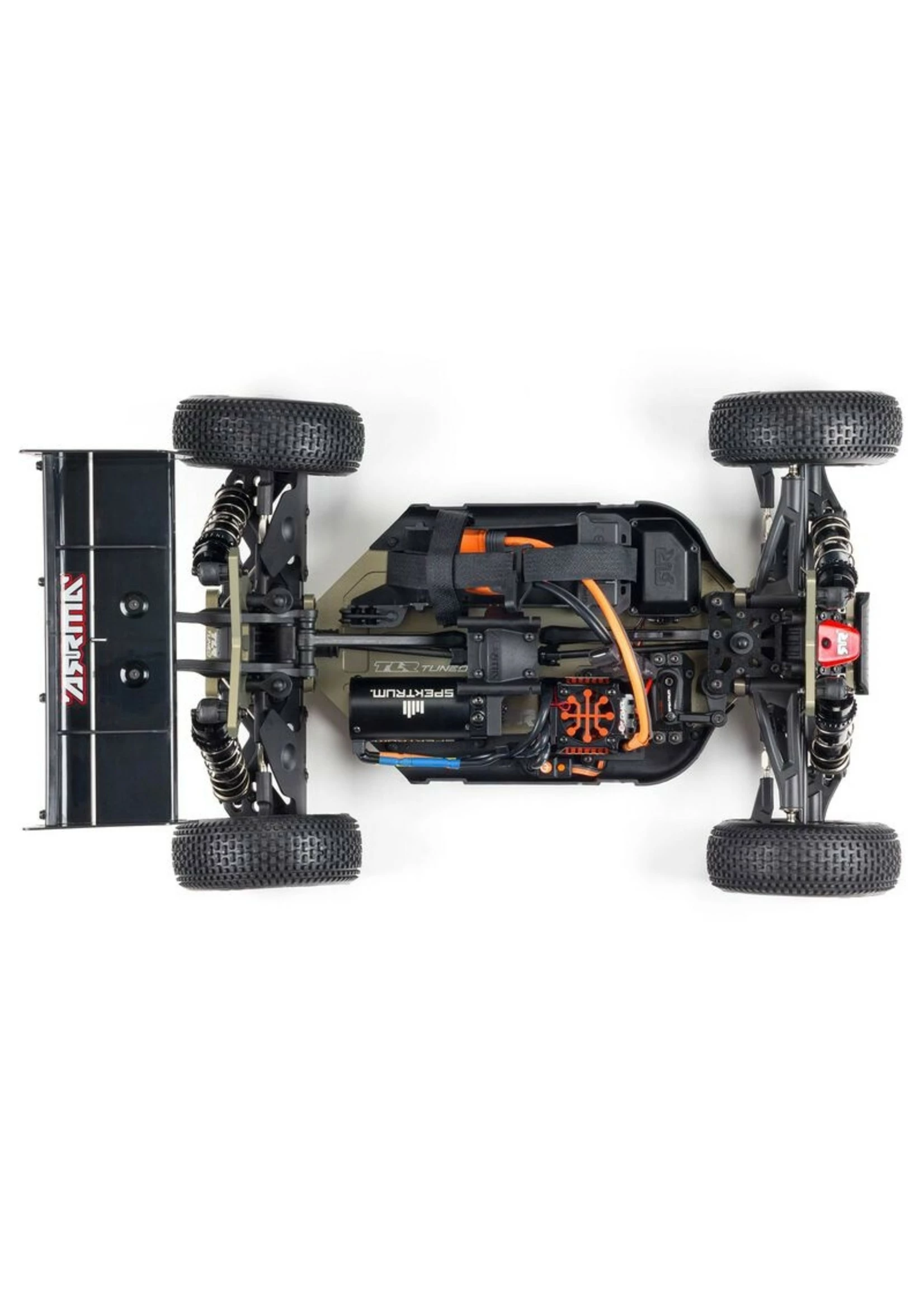 Loaded with high-end parts for improved strength, handling, and long-term durability, the 1/8 scale ARRMA TLR Tuned TYPHON 4WD Race Buggy gives bashers the perfect platform for entering competitive racing. It has the chassis tuning capabilities of a race spec buggy and arrives ready-to-run, with proven Spektrum radio and brushless power systems installed. The TLR Tuned TYPHON 4WD Race Buggy RTR comes prepared to hit the racetrack or the bash spot — you decide which! With its powerful 4S and 6S LiPo capable Spektrum brushless power system, the TLR Tuned TYPHON blasts over rough terrain with ease. On 4S, you can compete at your local racetrack. With the additional power of a 6S LiPo, the TLR Tuned TYPHON performs stunts and tackles big jumps at your favorite off-road bash location. The buggy’s durable TLR Tuned 7075-T6 aluminum upgrades include the chassis plate, steering rack, adjustable upper and lower suspension hangers, shock bodies, and front and rear shock towers. All are laser-etched with the TLR Tuned logo. The oil-filled, adjustable shocks have machined tapered pistons, machined shock guides, and X-ring seals, and are attached to the shock towers with Extreme Bash (EXB) stand-offs. The TLR Tuned TYPHON 4WD Race Buggy also features a heavy-duty drivetrain that holds up to extreme bashing and high-speed racing, with all-metal diff outdrives and gearbox internals plus durable steel driveshafts throughout. Its extra-strong wheel hubs support low-drag wheels on which ARRMA engineers have mounted multi-terrain, race compound dBoots EXABYTE tires for next-level grip. A Race Spec tunable rear wing helps to keep the tires and buggy grounded, contributing to confident control and responsive handling at high speeds. Maintenance downtime is kept to the minimum with an efficient, driver-friendly design. For example, an aluminum sliding mount gives you fast, hassle-free access to the factory-installed Spektrum Firma 4074 2050Kv brushless motor. Topping off the 1/8 scale TLR Tuned TYPHON 4WD Race Buggy RTR is a standout body finished in an exclusive paint scheme of Race Spec colors plus decals. It’s the ultimate ARRMA buggy for intermediate-level bashers with an eye towards racing.