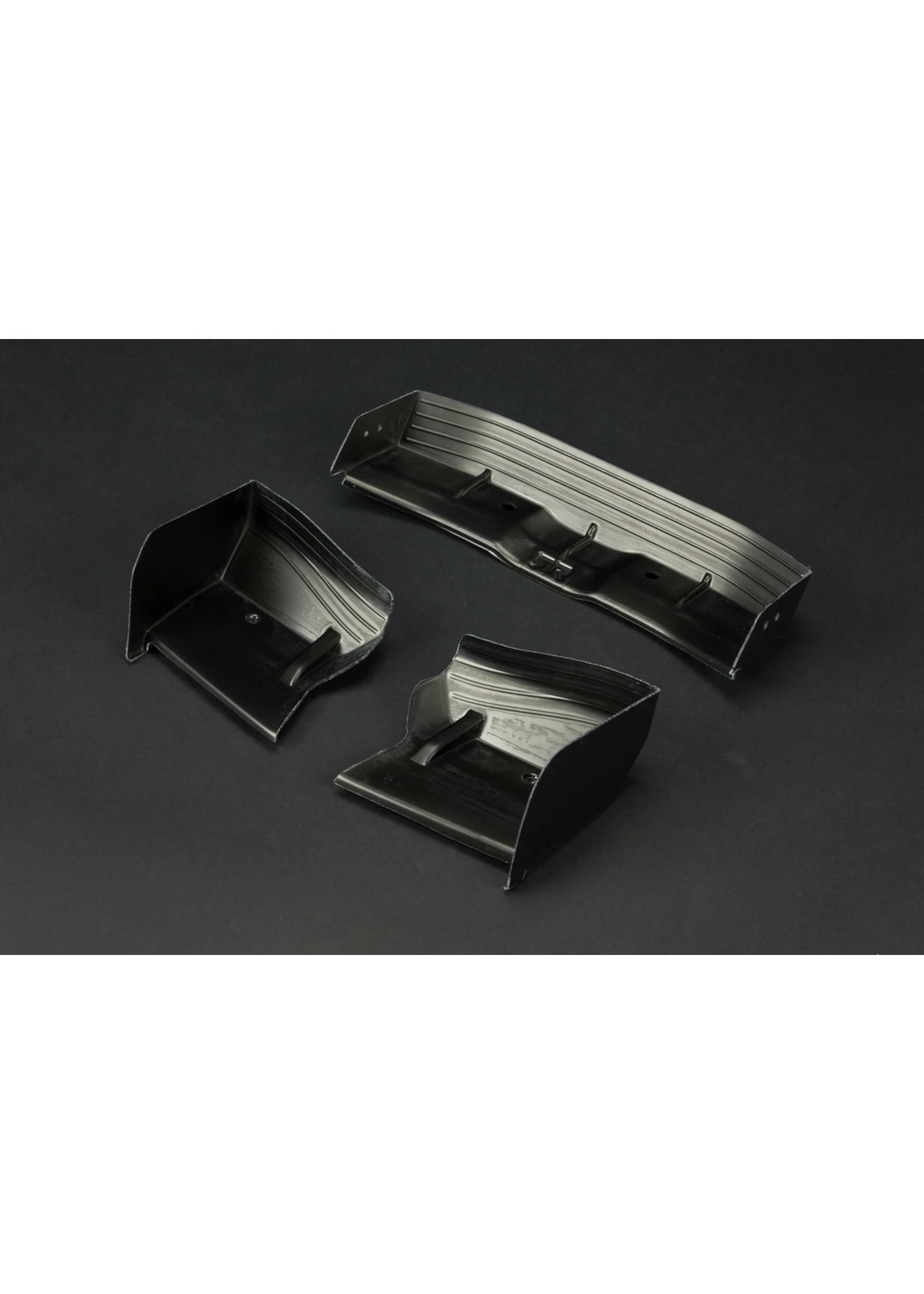 Includes rear wing and left and right front wing elements – Provided pre-painted in stealth black – Precisely machined mounting holes for fast and easy fit to your model – Strong and durable polycarbonate material – Molded-in cut lines for fine aero balance adjustment.