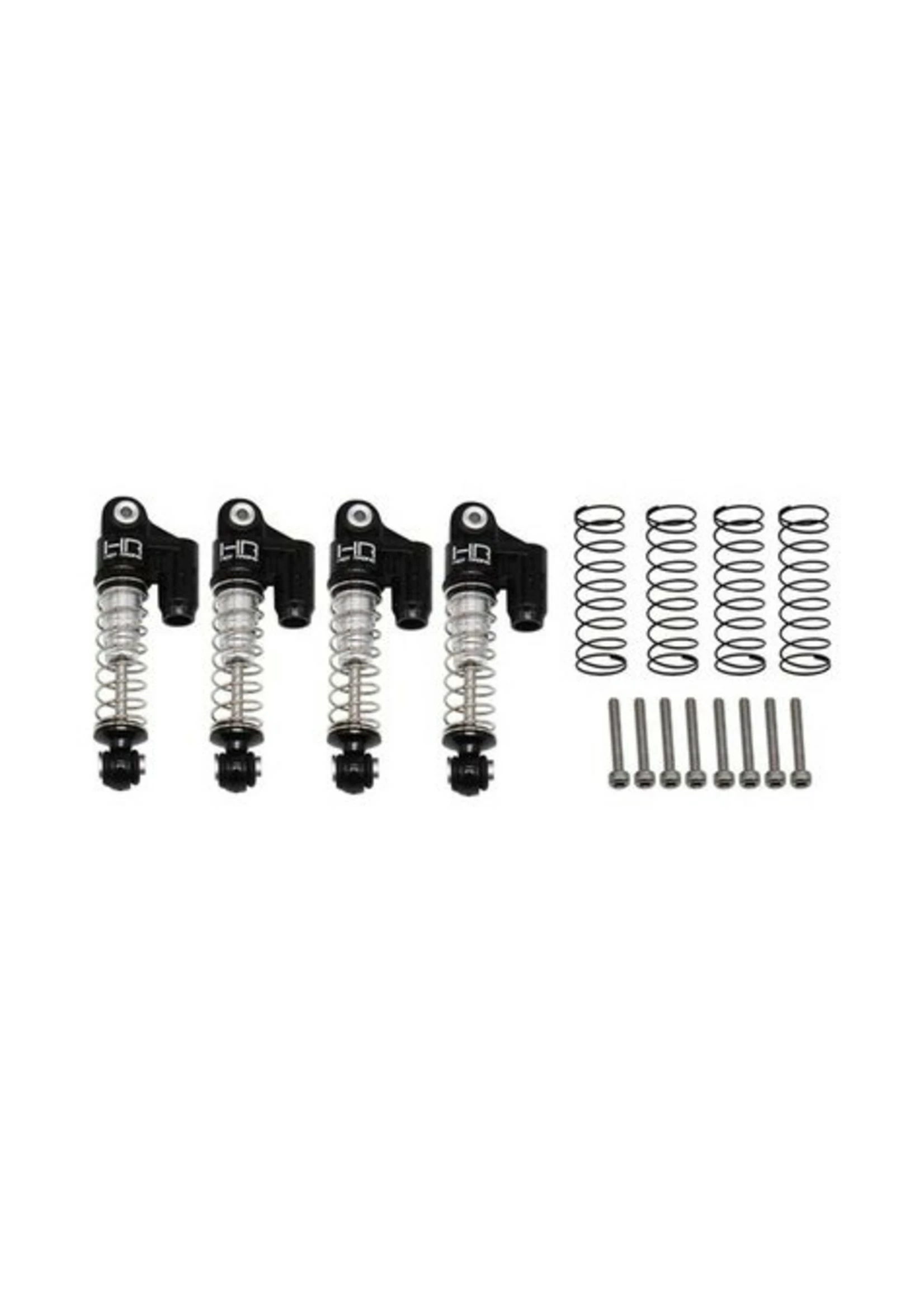 The Hot Racing Axial SCX24 Reservoir Friction Damper kit was developed for hte Axial SCX24, but may be compatible with other similar mini/micro crawlers as well. These shocks are friction damped, requiring only a partial filling of silicone oil. These shocks feature a machined faux reservoir shock cap for realistic scale looks, and include a full set of soft and hard springs to allow tuning. Package includes shocks, springs and hardware.
