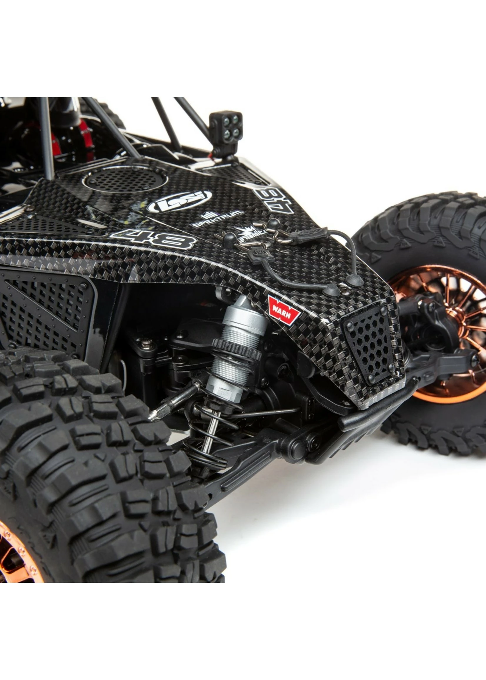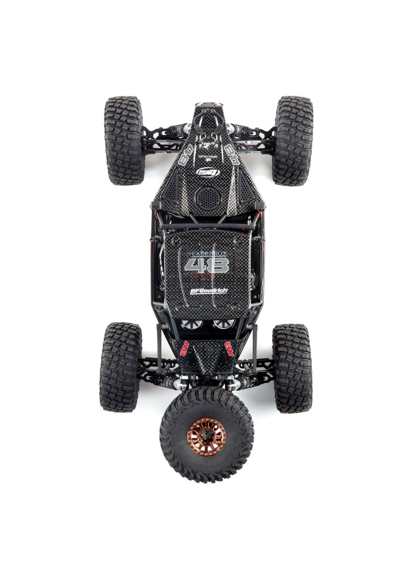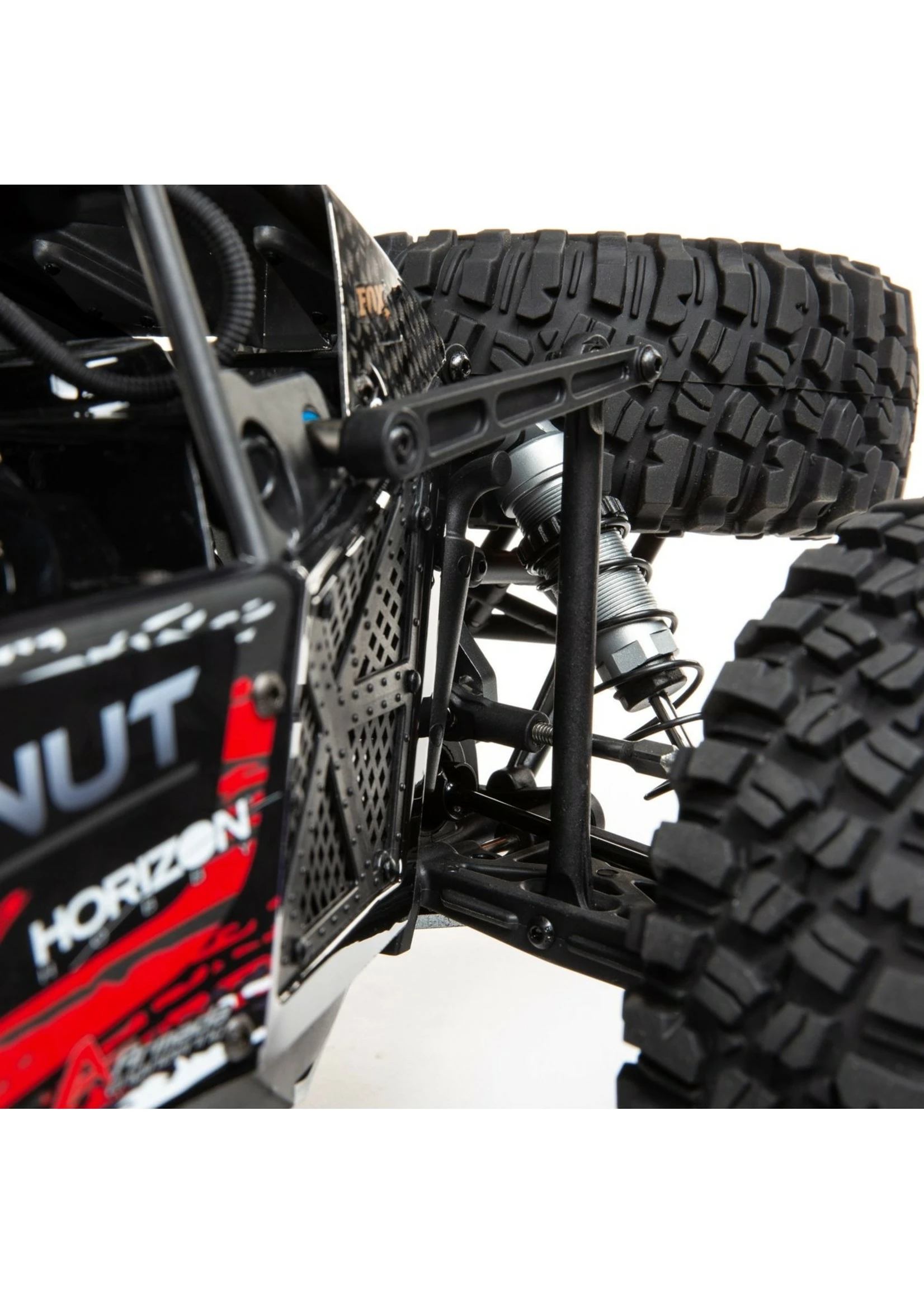 The TEN 4WD platform is recognized all over the world as the personification of strength and durability. The Losi® Lasernut U4 1/10-scale 4WD Rock Racer (RR) RTR with Spektrum™ Smart builds on the TEN design and adds items rock racers demand such as aluminum shocks, sway bars and adjustable turnbuckles. Plus, it includes a full metric hardware package for worldwide compatibility. The Lasernut is currently the only complete Unlimited U4 FIS (Full Independent Suspension) racer on the market featuring all the technological advances drivers demand including the Spektrum Firma Smart 130A Brushless ESC and Spektrum Firma 4-Pole 1900kv 550 motor providing greater efficiency improving run times with increased power. Of course, the ESC is waterproof, completely programmable and comes pre-wired with a high-current IC5™ connector. Drivers stay in control with a DX3™ transmitter, a Spektrum AVC® receiver with steering priority, and an officially-licensed Lasernut race-inspired scale U4RC body/roll cage with two different graphics and color variations. Working together with BFGoodrich Tires, the Lasernut U4 has scaled down KM3 tires that have an aggressive tread pattern capable of handling any terrain. The Losi Lasernut Rock Racer is the ultimate U4 racer with scale looks, insane speeds and performance, and Spektrum Smart Technology.