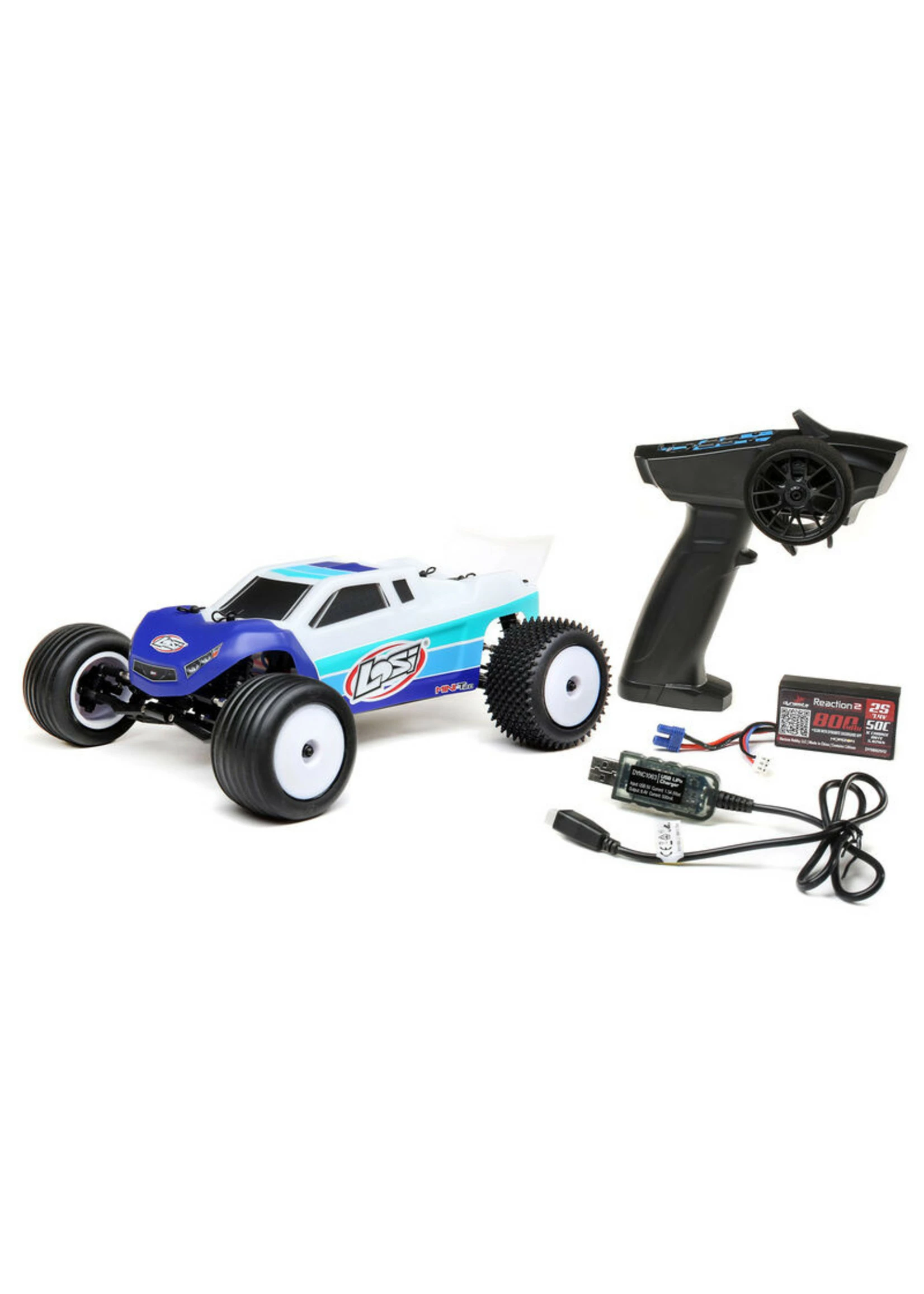 The Mini-T 2.0 Brushless comes fully assembled and ready to rock. Just install the included AAA batteries in the transmitter, charge the included LiPo battery with the included charger.