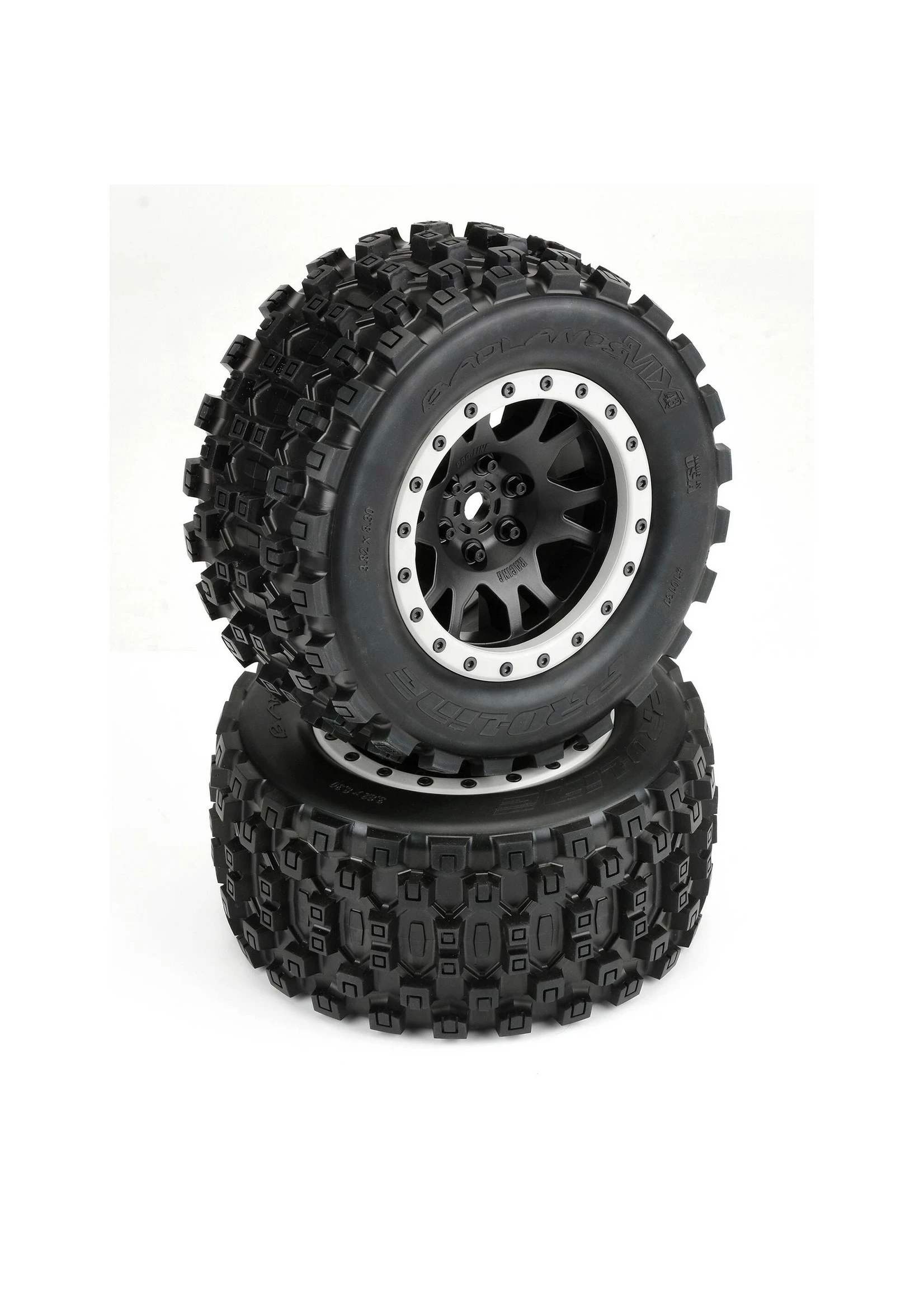 This is a pair of pre-mounted Badlands MX43 tires for X-MAXX®. Pro-Line is ready to unleash the long-awaited tire solution for X-MAXX® owners with the Biggest and Baddest tire and wheel combo ever conceived: the Badlands MX43 mounted on Impulse Wheels! Pro-Line Badlands tires are known for having a sweet Motocross inspired tread and the all-new Badlands MX43 tires kick that up a notch with a Bigger and Bolder knobby tread that matches modern MX tire design. These tires have been developed from the ground up for extreme X-MAXX® punishment with an all-new ultra-durable compound that prevents tire ballooning even at high speeds. The Badlands MX43 features Pro-Line’s ground breaking proprietary Pro-Loc Technology that creates an ultra-secure bond to Pro-Line’s Impulse Pro-Loc X-MAXX® wheels while still being removable when required. The Badlands MX43 is a true All-Terrain tire that will find traction on any surface but is best suited for loose & loamy dirt, mud or grass. Just imagine your X-MAXX® throwing up huge rooster tails with these aggressive looking tires!