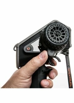 A versatile front chassis guard enhances durability further and provides mounting options for user-integrated accessories such as a camera or light source. A pair of lanyard mounting points let you keep your hands free when not driving. A convenient accessory compartment can hold your small tools. Spektrum™ engineers also gave the transmitter extra water-resistance; an aggressive, off-road style steering wheel; and an innovative thumb-lever for safe, precise one-handed control.