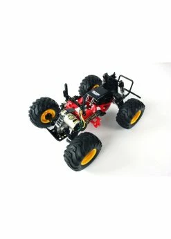 This hardy model’s rear-wheel drive chassis is based around a durable red ABS space frame to withstand all-action off-road driving. 4-wheel independent suspension uses CVA oil dampers, and has double wishbone front and trailing arm rear setups. Superlative cushioning and grip are provided by 123mm-diameter, 60mm-width lug pattern tires on yellow wheels. Efficient and durable universal shafts come with rubber boots. A sturdy sealed gearbox protects the differential inside from dust and dirt.