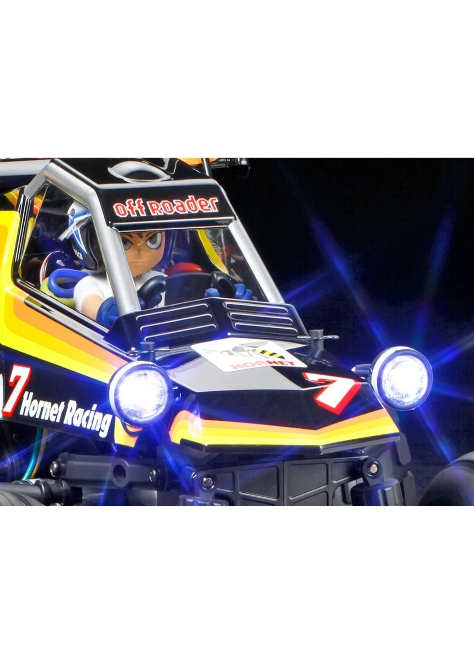 The original Hornet needs little introduction. It was a Tamiya legend which inspired legions of fans since the 1980s. For many, it was their very first introduction into the world of radio control assembly kits. The original Hornet is still among Tamiya’s best-selling kits to this day. Now the legend is re-imagined as the Comical Hornet, with a new body inspired by the famous original. The re-imagined body, which includes a newly designed driver figure, sits on a new and dedicated variant of the proven off-road chassis: the WR-02CB.