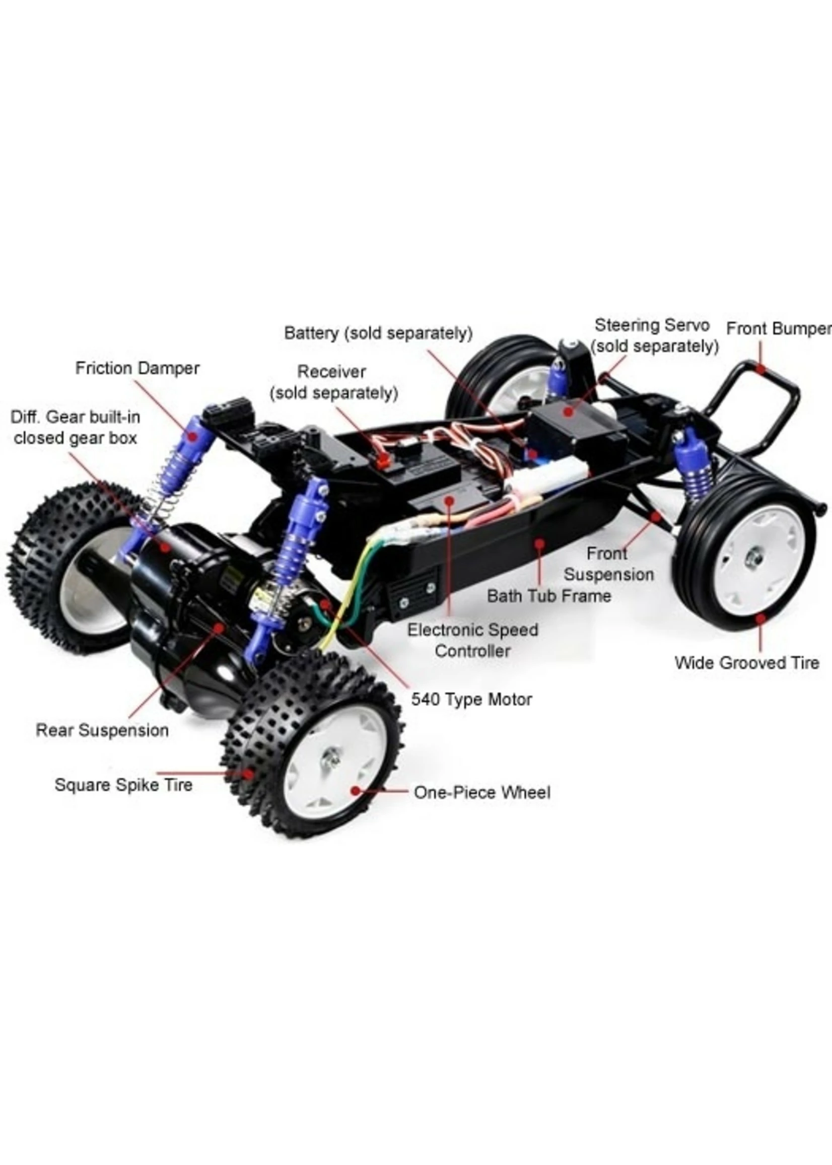 The Rising Fighter plastic body is fastened to a bathtub resin monocoque chassis by screws, creating a solid frame that can absorb any type of rough handling. Off-road tracks can be tackled with ease thanks to coil spring dampers, and independent swing axle front and rigid axle rear suspension. Diff loaded sealed gearbox keeps out the dirt and stones for smooth driving and cornering. Pin-spike style rear tires and grooved front tires combined with 1-piece type wheels offer excellent grip performance on dirt surfaces. Half-body driver figure adds that finishing touch to a fun off-road R/C car.