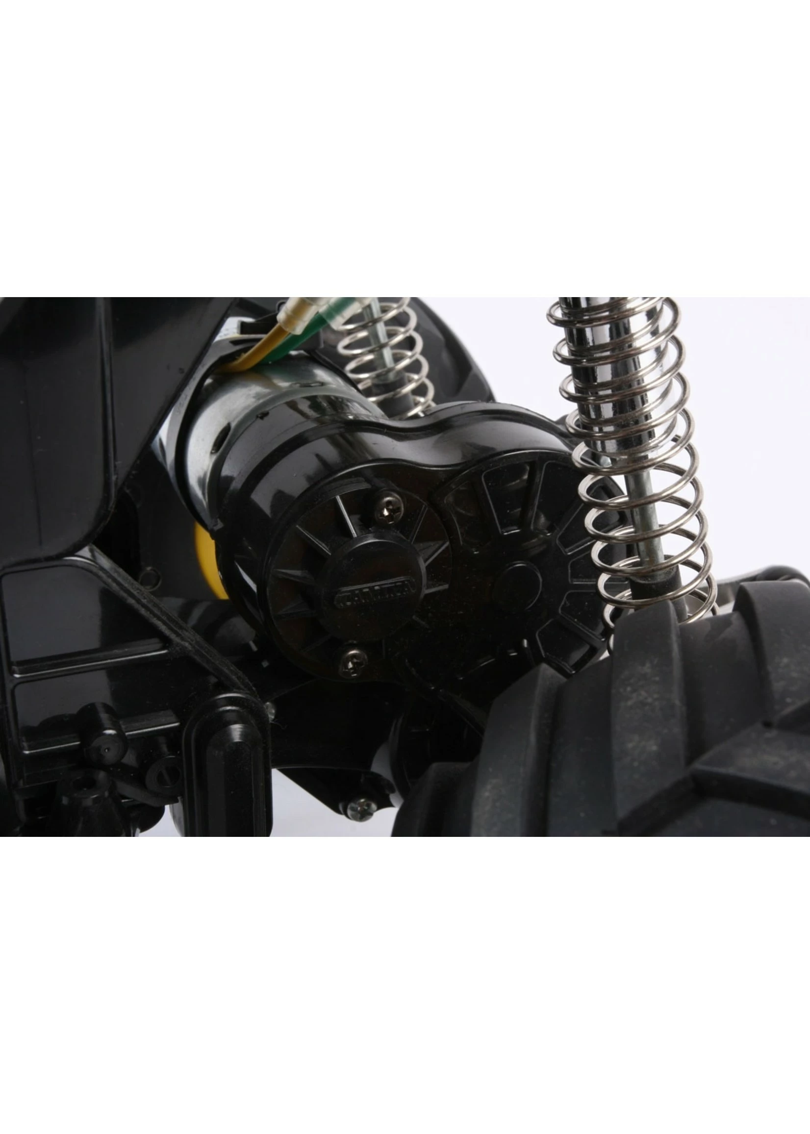 The durable and easy-to-assemble 2WD chassis employs a box type frame, front swingarm independent and rear rolling rigid suspension. Big 115mm diameter semi-pneumatic tires on black wheels offer dynamic running on even the toughest of surfaces. The sealed gearbox protects diff gear from dirt and sand during off-road driving and a rear mounted wheelie bar enables wild wheels in the air stunt driving.
