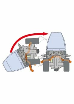 The T3-01 is a three-wheeled chassis comprised of two main sections (front and rear) connected by a center link; the front section houses R/C equipment and the power source, while the rear holds the integrated gearbox and motor. Positioned in the back of the front section, the servo applies motion to the rear section, which in turn makes the front lean. Support arms are moved by the servo, and help the model to self-right in the event that it turns onto its side. At the front, a telescopic fork has a built-in coil spring, while the rear features a cam-slide setup with cams on the rotating pitch axis: sliding left and right, they actuate the built-in coil spring to cushion the rear. A planetary differential gear is integrated into the rear axle.