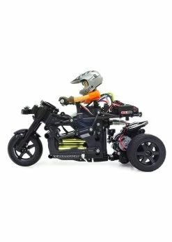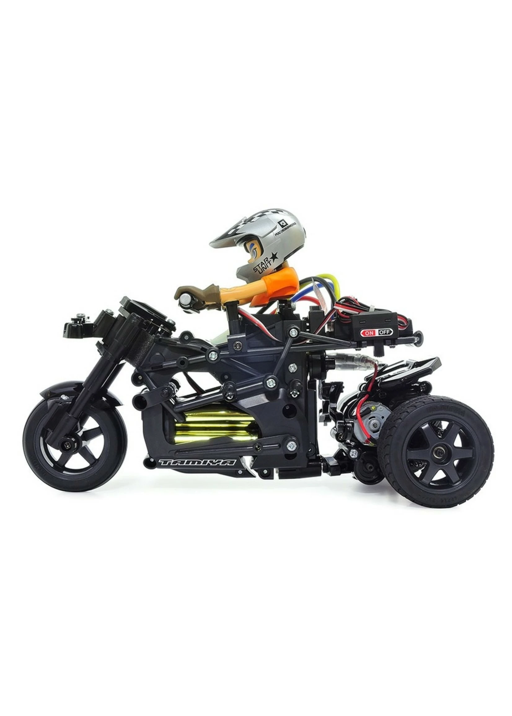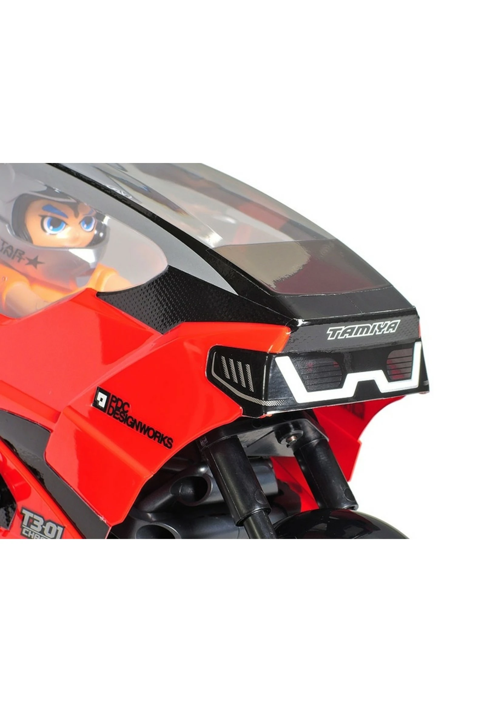 This radio control model is the second on the Tamiya T3-01 chassis series. The body in this kit replicates a sleek, futuristic styling form. Furthermore, the included brand-new rider figure is highly detailed, which makes driving the T3-01 chassis more dynamic. When the model turns, the 3-wheel chassis “leans” into the corner much like their full-size counterparts. Furthermore, the 3-wheel chassis features the motor in the rear section, with the battery in the front. The two sections are linked in the middle, and a steering servo leans the entire front section left and right to effect turns. Furthermore, support arms are linked to the steering servo, and help to right the model if it happens to tip over.