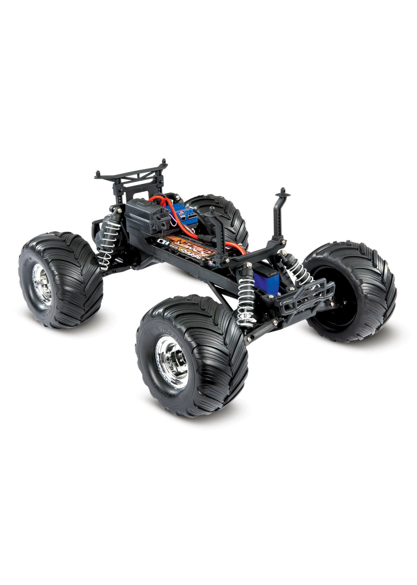 BIGFOOT is no shelf queen. This monster truck is built to fly through the air over giant jumps and rip epic roosts with its massive tires. Based on the proven strength and reliable performance of the 2WD Stampede, BIGFOOT rides high and runs fast with 30+mph speed and ground-pounding durability. The Titan 550 motor’s brute power makes this monster truck a sure winner and the waterproof electronics make the whole world your arena. Mud, rain, and snow won’t stop the show! BIGFOOT arrives fully assembled and Ready-to-Race out of the box. Just charge up the battery and prepare for all-out excitement! BIGFOOT No. 1 is monster truck royalty with the excitement and driving fun that could only come from Traxxas.