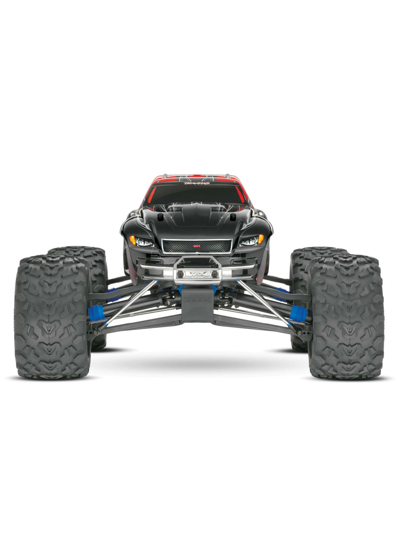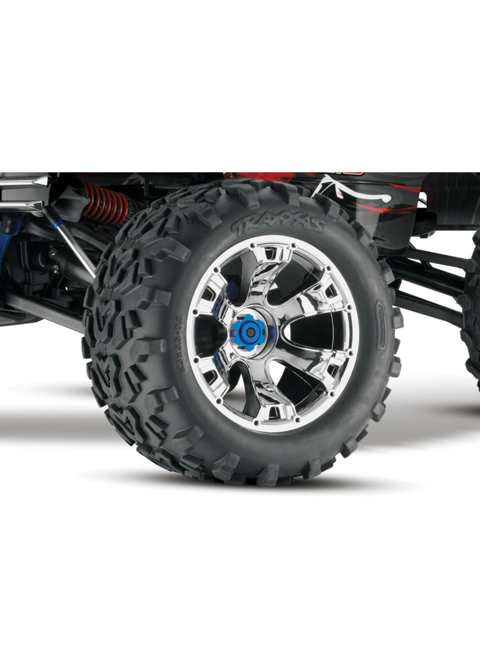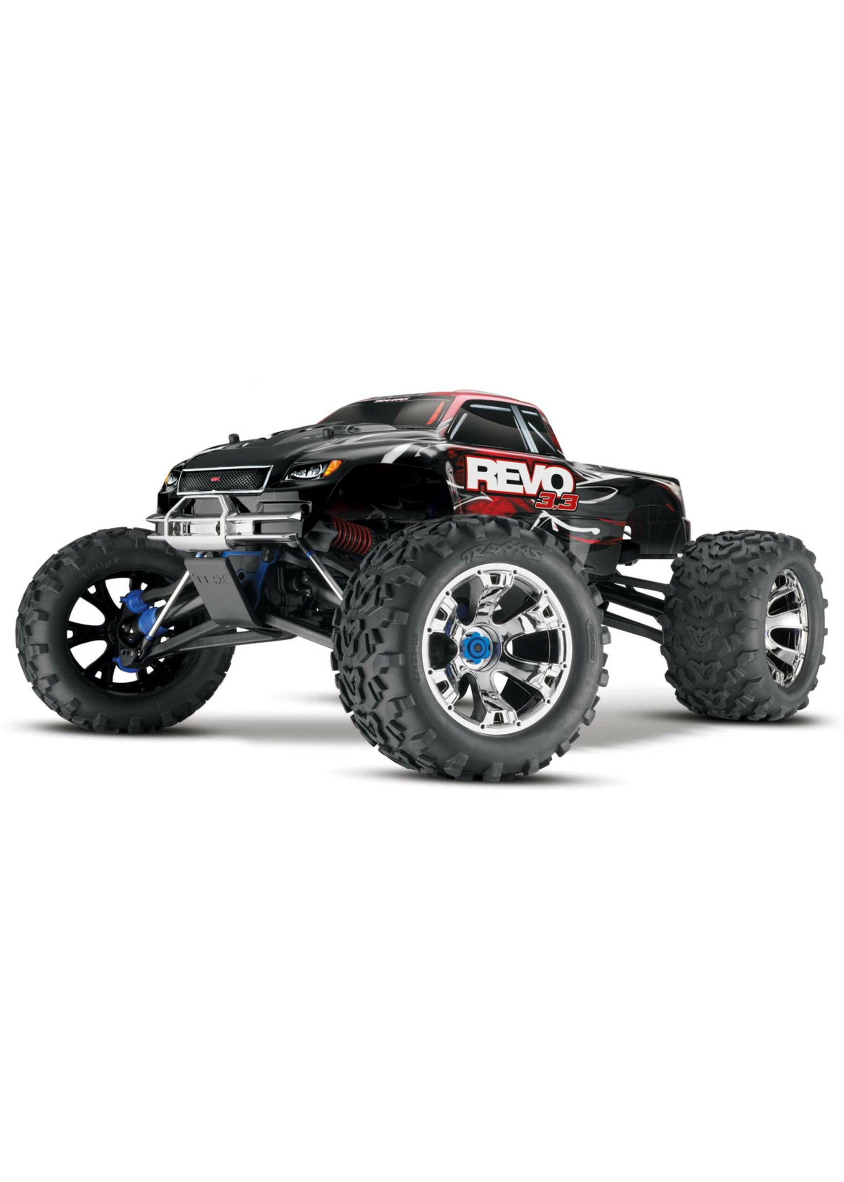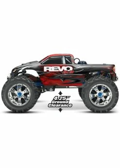 Revo’s specifications are more than just an impressive list of features. They are each specifically engineered and integrated into the model to provide capability, convenience, and most importantly, fun! Revo 3.3’s heavy-duty reversing transmission lets you easily back out of tight spots with the flick of a switch, while the OptiDriveElectronic Transmission Control guarantees safe, smooth engagement. The Traxxas TQi 2.4GHz radio system features the exclusive Traxxas Link wireless Module with factory-installed telemetry sensors, a revolutionary concept that harnesses the power of your Android, Apple iPad, iPhone or iPod touch to create the ultimate radio system. Geode chrome wheels with 17 mm hex hubs wear massive 6.3″ Maxx-sized tires for big ground clearance and total traction in all conditions. Revo 3.3’s dual-digital servo steering system delivers 250 oz.-in of torque for powerful, responsive handling, plus they’re waterproof for ultimate reliability.