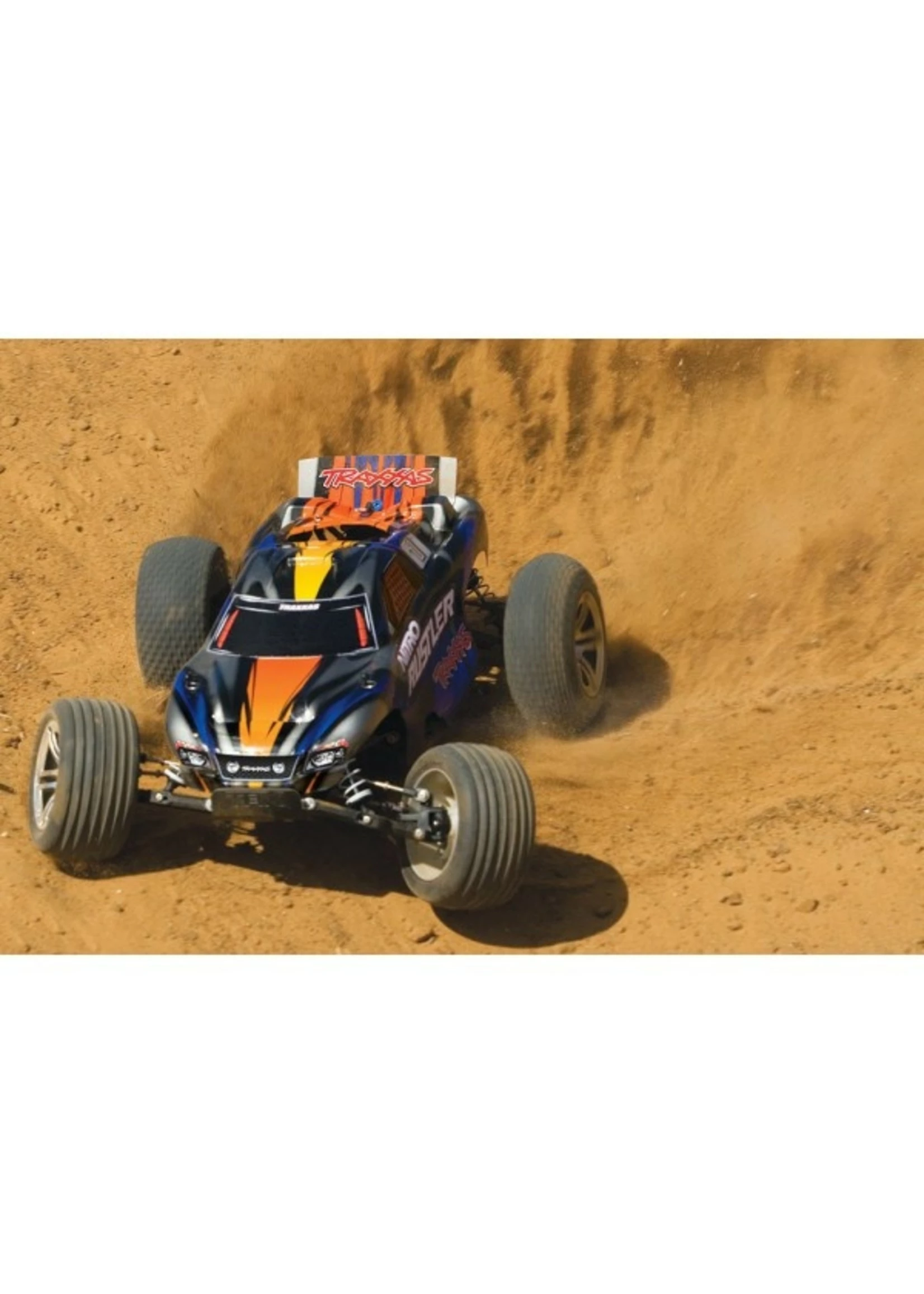Traxxas Stability Management TSM® allows you to experience all the extreme power, speed, and acceleration that was engineered into your Nitro Rustler making it much easier to control on common slippery surfaces such as loose dirt, smooth concrete, and even ice and snow. Punch it off the line and TSM goes to work sensing the vehicle’s direction and making steering corrections to provide straight-ahead full-throttle acceleration without fishtailing, spinouts, and loss of control. TSM also works during cornering, first making intuitive corrections to maintain your line, and then allowing you to hammer the throttle earlier in the turn for much faster exit speeds. Braking is dramatically improved as TSM works to keep you arrow straight until you come to a complete stop.