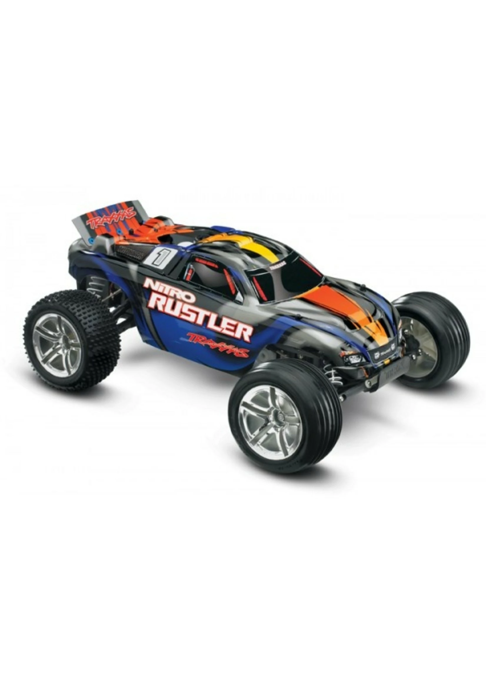 The Nitro Rustler is the first name in high performance 2WD nitro stadium trucks. Powered by the proven performance of the TRX 2.5 Racing Engine, Nitro Rustler totally out-muscles the competition with top speeds beyond 50 mph! The TRX 2.5 also pumps out the torque for brutal, wheel-standing launches and absolutely ruthless acceleration. The sleek body design cheats the wind with its smooth curves and low-slung stance, while the outrageous graphics dominate with style. The separate wing securely bolts to the body with precise aluminum hex hardware. Chrome 2.8 Twin Spoke™ rims are wrapped with pre-glued Alias™ step-pin tires in the rear and Alias™ ribbed tires up front. The high-tech rubber compound ensures great grip on a variety of surfaces. Grey-molded composite parts are thoughtfully integrated to enhance the look of the chassis. Fast, light, and loaded with power, Nitro Rustler’s power-sliding, dirt roosting attitude will have you reaching for the throttle again and again.