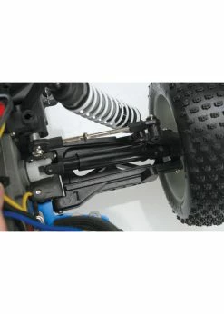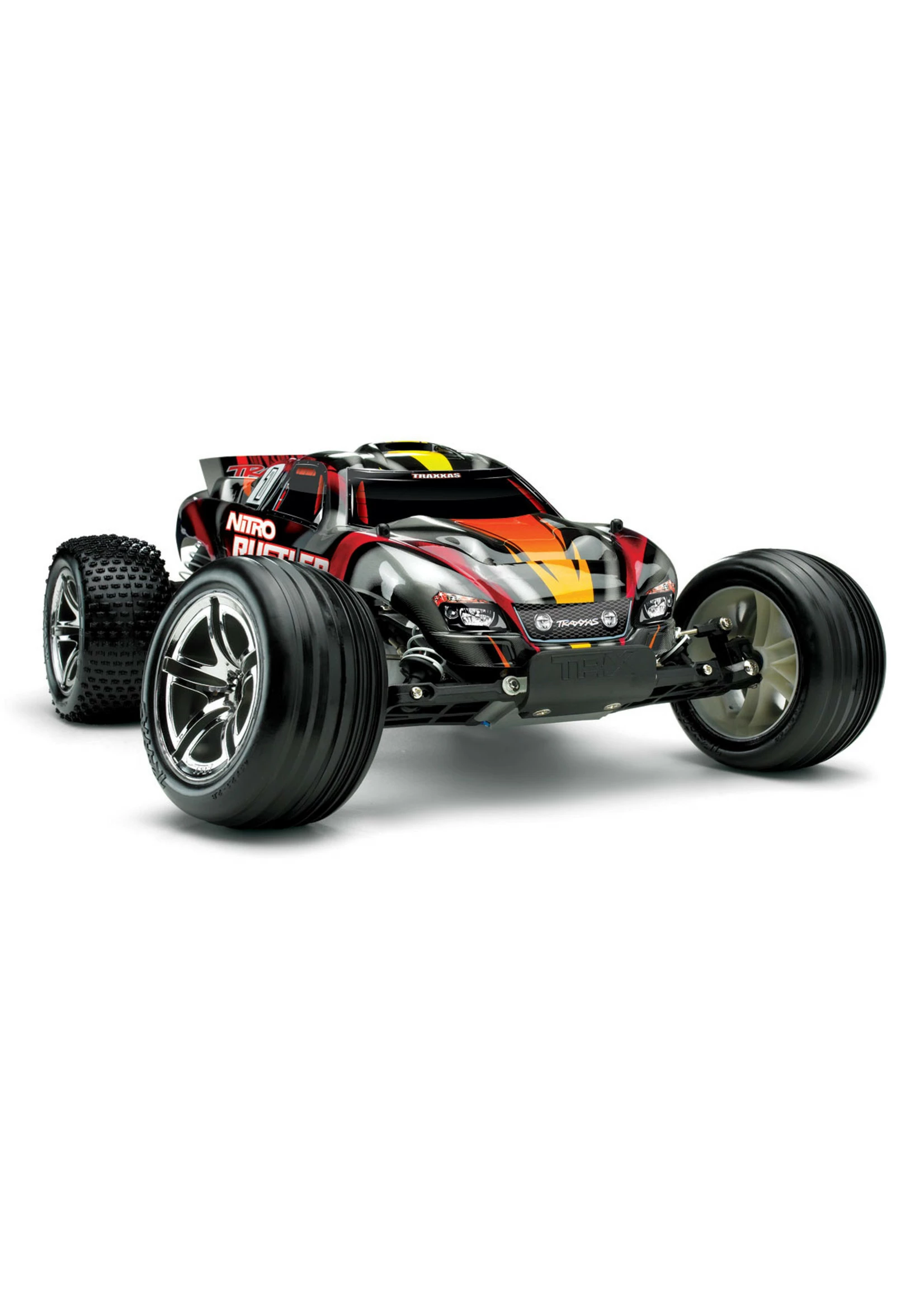 The Nitro Rustler is the first name in high performance 2WD nitro stadium trucks. Powered by the proven performance of the TRX 2.5 Racing Engine, Nitro Rustler totally out-muscles the competition with top speeds beyond 50 mph! The TRX 2.5 also pumps out the torque for brutal, wheel-standing launches and absolutely ruthless acceleration. The sleek body design cheats the wind with its smooth curves and low-slung stance, while the outrageous graphics dominate with style. The separate wing securely bolts to the body with precise aluminum hex hardware. Chrome 2.8 Twin Spoke™ rims are wrapped with pre-glued Alias™ step-pin tires in the rear and Alias™ ribbed tires up front. The high-tech rubber compound ensures great grip on a variety of surfaces. Grey-molded composite parts are thoughtfully integrated to enhance the look of the chassis. Fast, light, and loaded with power, Nitro Rustler’s power-sliding, dirt roosting attitude will have you reaching for the throttle again and again.