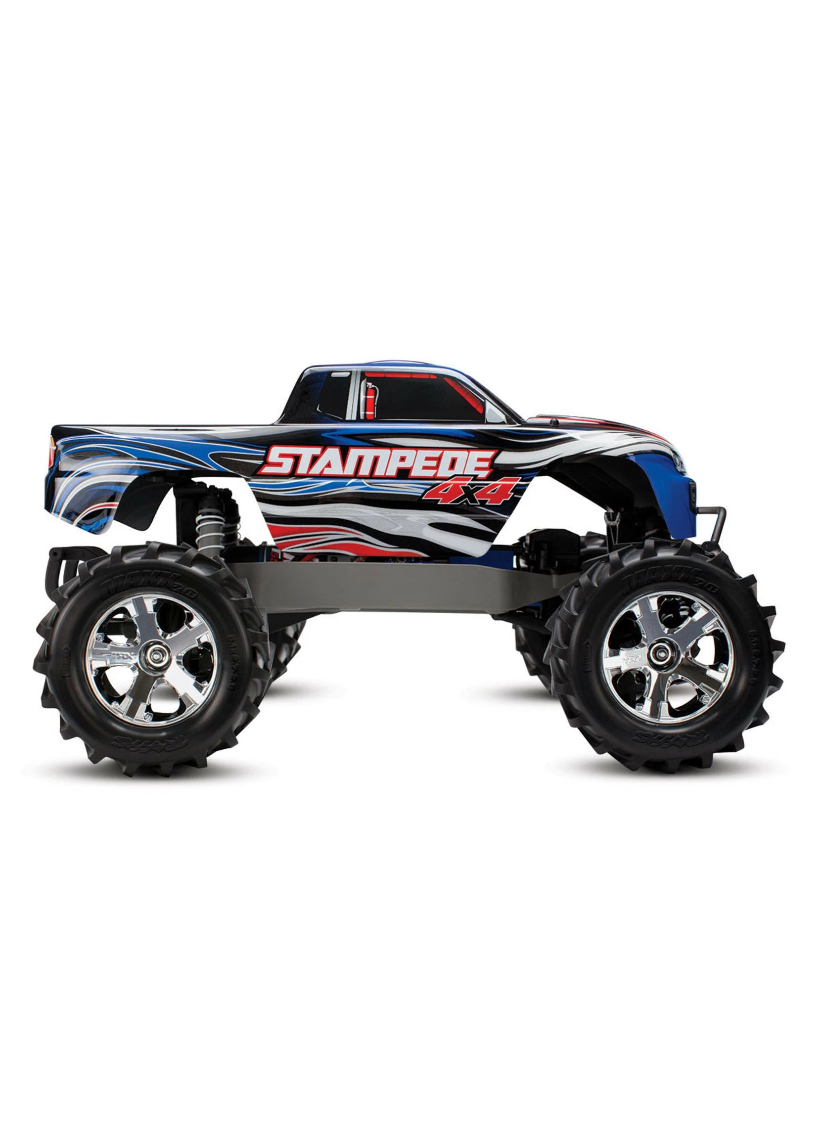 Stampede 4X4 is built on the proven performance of the advanced shaft-driven 4WD system and innovative modular design of the award-winning Slash 4X4. The chassis fully integrates the electronics and battery compartment for an efficient and compact layout, and maintains the high center ground clearance that gives Stampede its monster stance and high-riding look. The extra clearance drastically increases the off-road versatility that allows you to tackle rougher terrain and bigger obstacles. The Stampede 4X4 feels planted and secure at speed, even on pavement and in other high-grip conditions. Stampede 4X4 is 100% monster truck, but it handles like a racing machine!