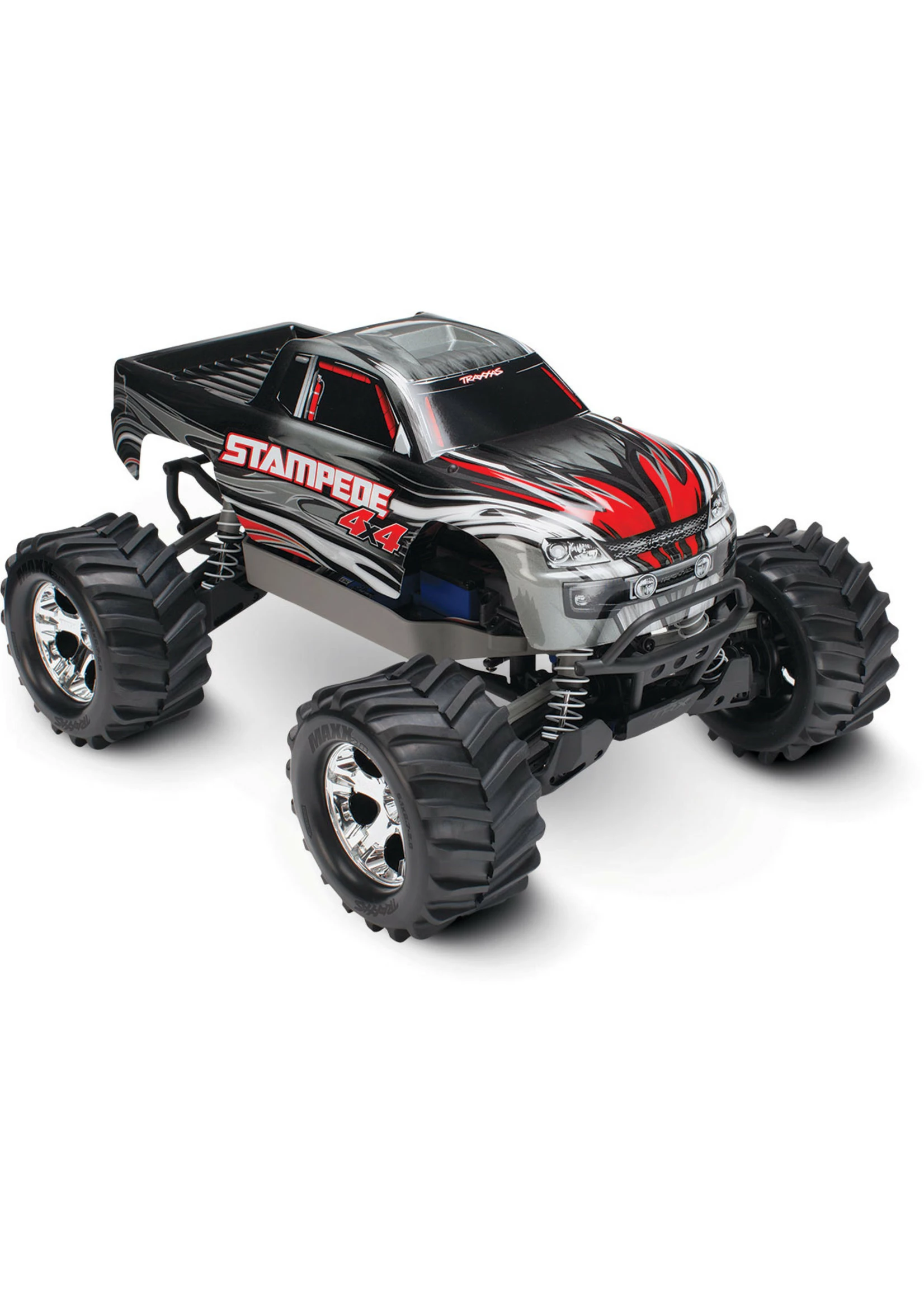 Speed, style, versatility, and fun…Stampede 4X4 has it all! The Stampede 4X4 is built Traxxas Tough™ to withstand all the 4-wheel drive monster mayhem you can dish out. Its tall, drive-over-anything ground clearance and ultra-tough, long-arm suspension make Stampede 4X4 feel nearly indestructible. Chrome All-Star™ 2.8″ wheels give Stampede 4X4 aggressive style, and soft Chevron Maxx™ tires deliver true multi-terrain capability. The XL-5 ESC and Titan 550 motor dish out plenty of driving excitement. It’s all waterproof, so the fun keeps going through all kinds of wet conditions! No other truck offers Stampede 4X4’s unique style, capability, and reputation for durability. Stampede 4X4 is perfect for almost any age driver or skill level and comes fully assembled, painted, and Ready-to-Drive® with included 8.4V NiMH battery pack and charger.