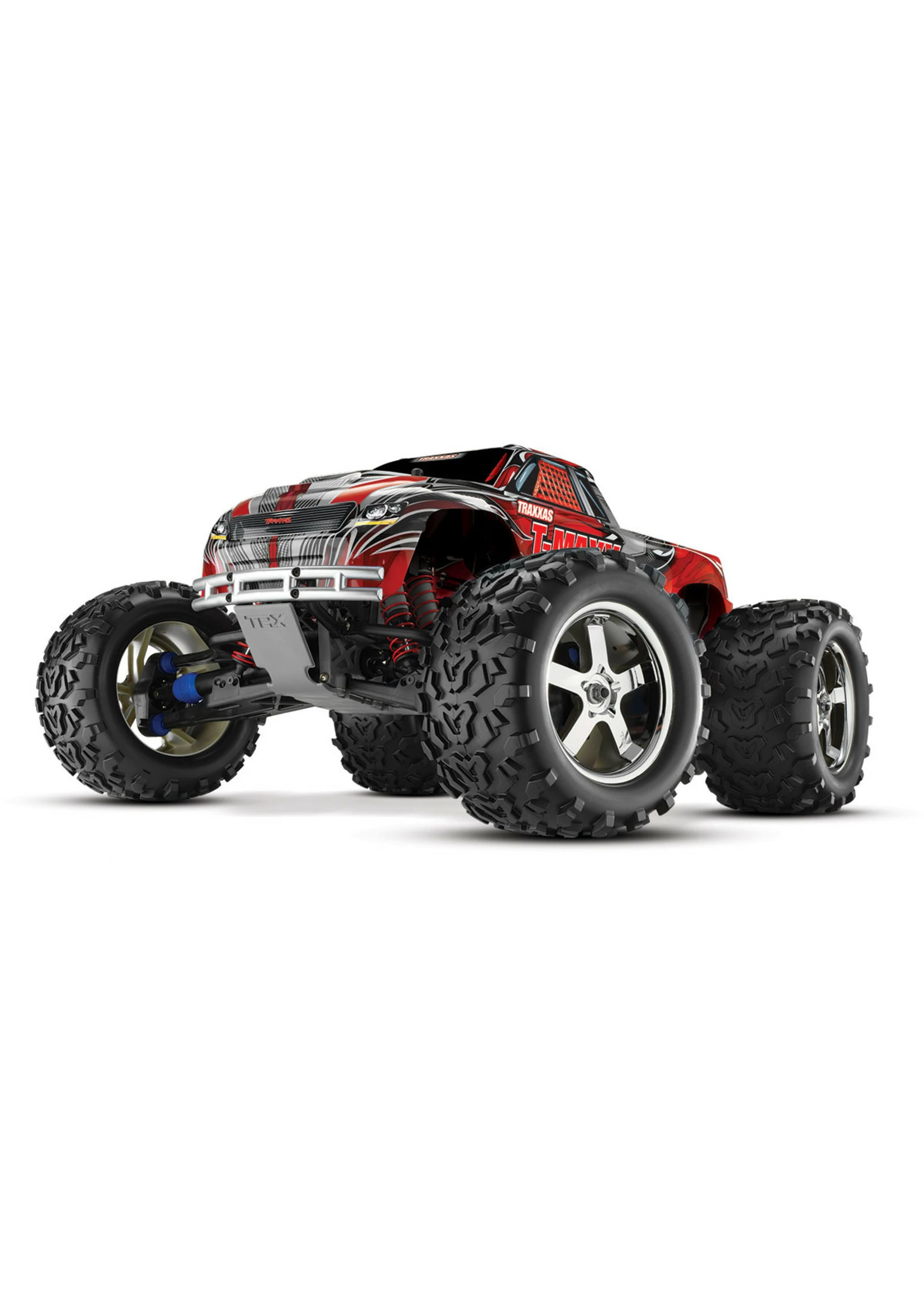 The T-Maxx 3.3 is the biggest Maxx ever. Giant Maxx tires deliver massive grip off-road and at 6.3″ tall, they add increased ground clearance to gobble up deep ruts and overcome huge boulders. In the city, urban obstacles such as curbs and stairs beckon for an all-out Maxx assault. Maxx tires come pre-glued to 3.8″ Mirror-Chrome Hurricane wheels. Traxxas engineers equipped the T-Maxx 3.3 with an extended wheelbase (30 mm longer) for maximum stability. T-Maxx is able to put more power the ground for even more acceleration and amazing directional control. There’s no skimping when it comes to the chassis. It’s formed from 4 mm thick 6061-T6 aluminum and then anodized in brilliant blue. Meaty chassis braces and a rugged skid plate add rock-solid rigidity.