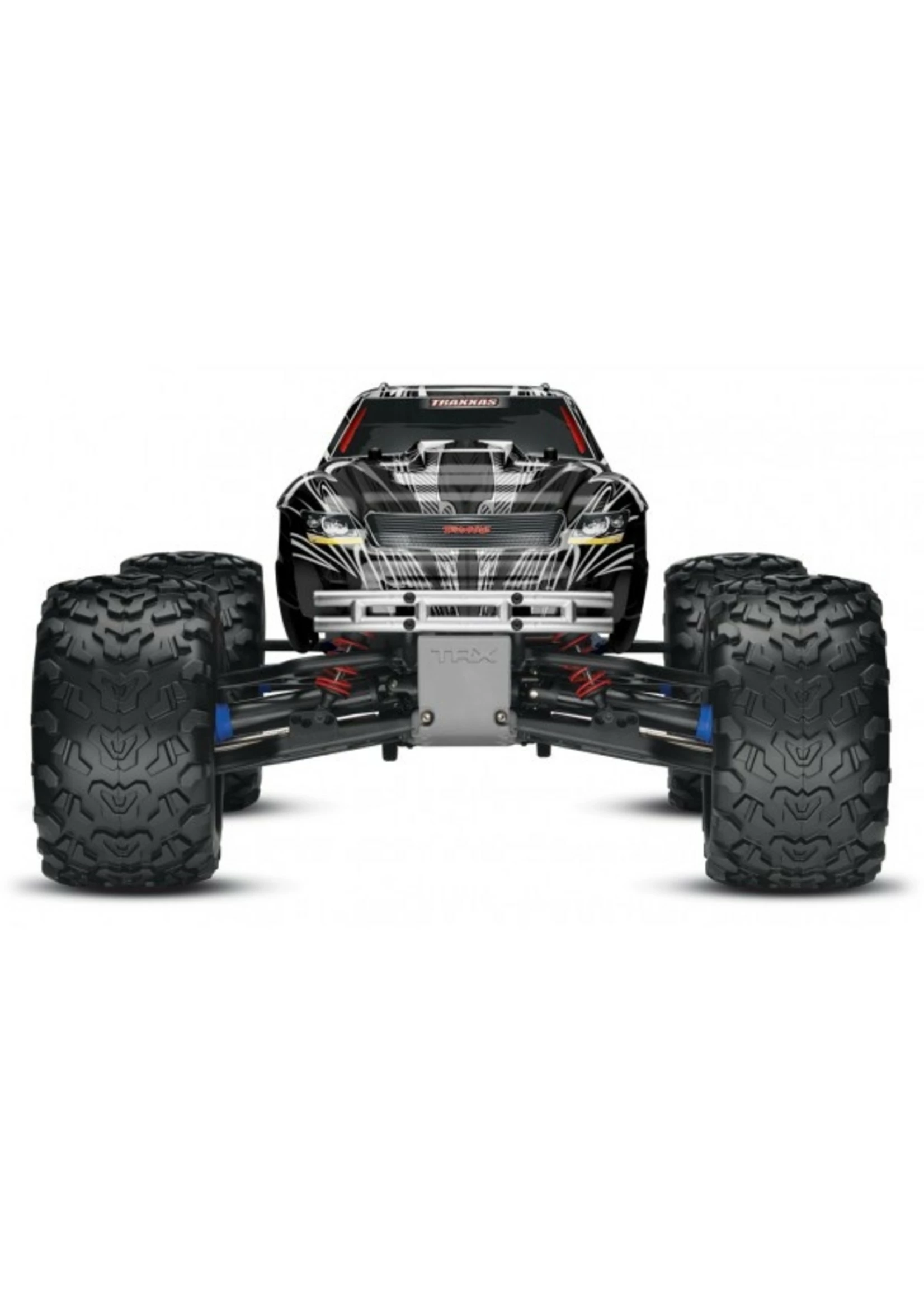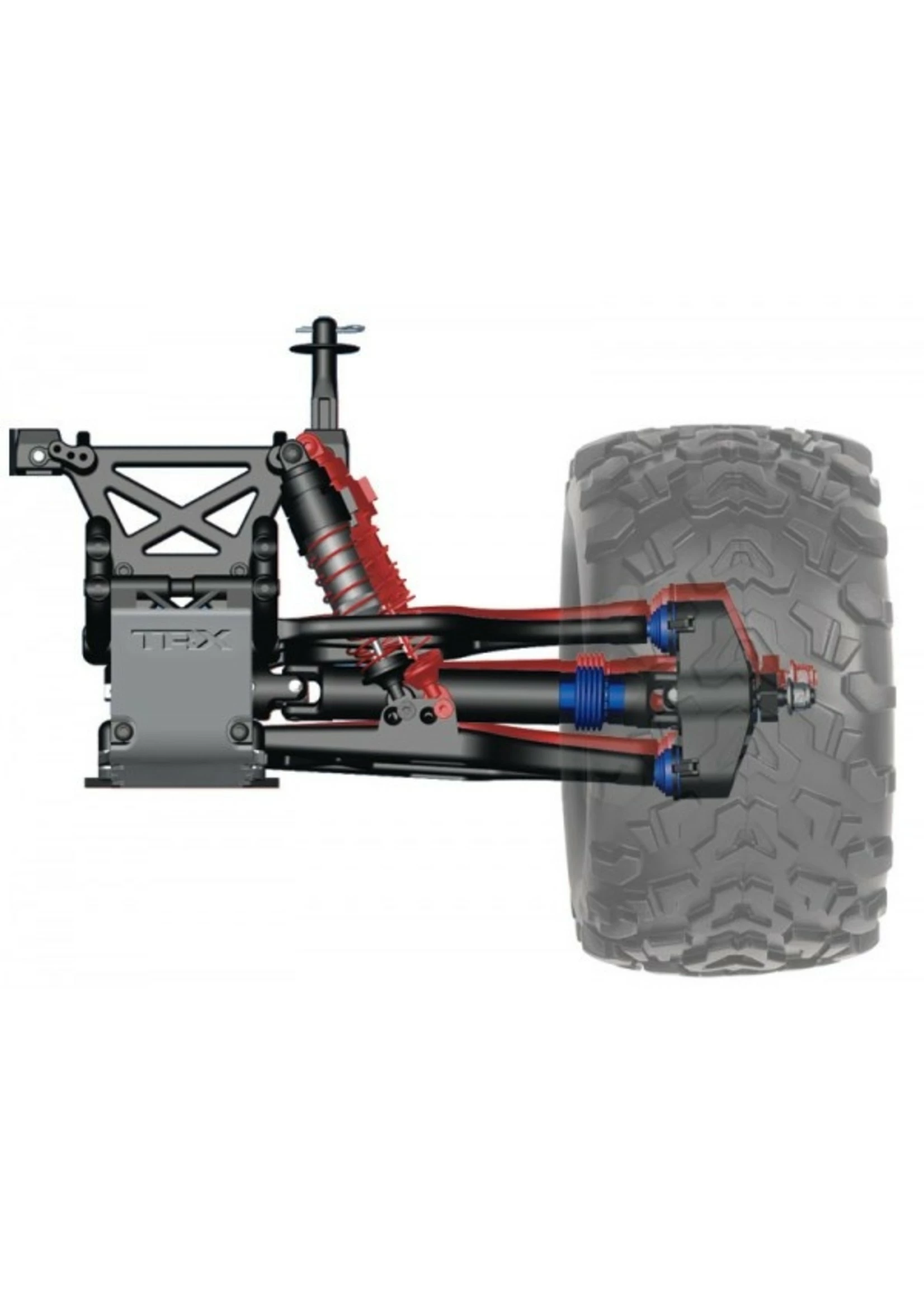 The T-Maxx 3.3 is the biggest Maxx ever. Giant Maxx tires deliver massive grip off-road and at 6.3″ tall, they add increased ground clearance to gobble up deep ruts and overcome huge boulders (be sure to check out the videos!). In the city, urban obstacles such as curbs and stairs beckon for an all-out Maxx assault. Maxx tires come pre-glued to 3.8″ Mirror-Chrome Hurricane wheels. Traxxas engineers equipped the T-Maxx 3.3 with an extended wheelbase (30mm longer) for maximum stability. T-Maxx is able to put more power the ground for even more acceleration and amazing directional control. There’s no skimping when it comes to the chassis. It’s formed from 4mm thick 6061-T6 aluminum and then anodized in brilliant blue. Meaty chassis braces and a rugged skid plate add rock-solid rigidity.