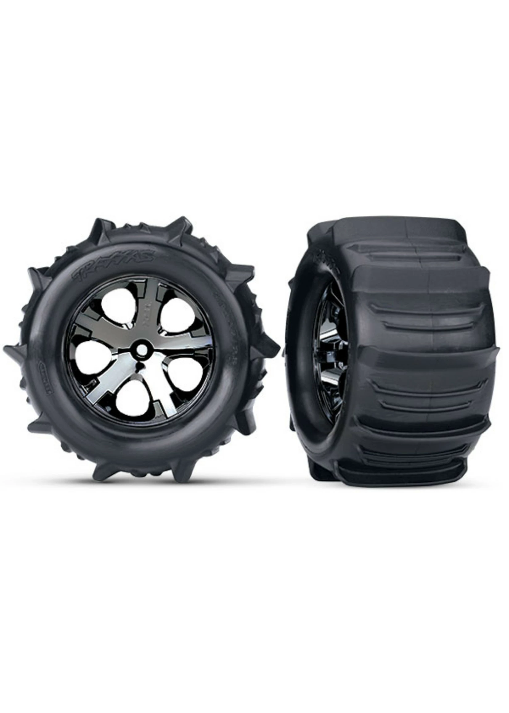 Traxxas Paddle Tires let you tear up sand, snow – and even water! These 2.8″ size paddles are pre-mounted on All-Star Electric Rear Wheels that will fit the Stampede and Rustler trucks, and will allow you to explore a whole new dimension of traction. Package includes two pre-mounted tires.