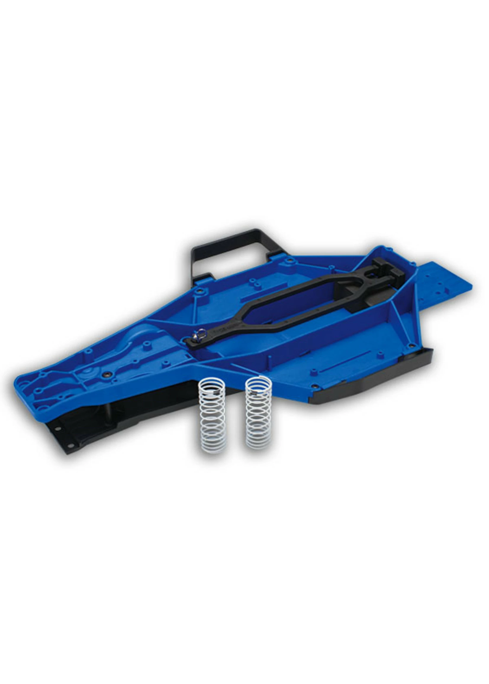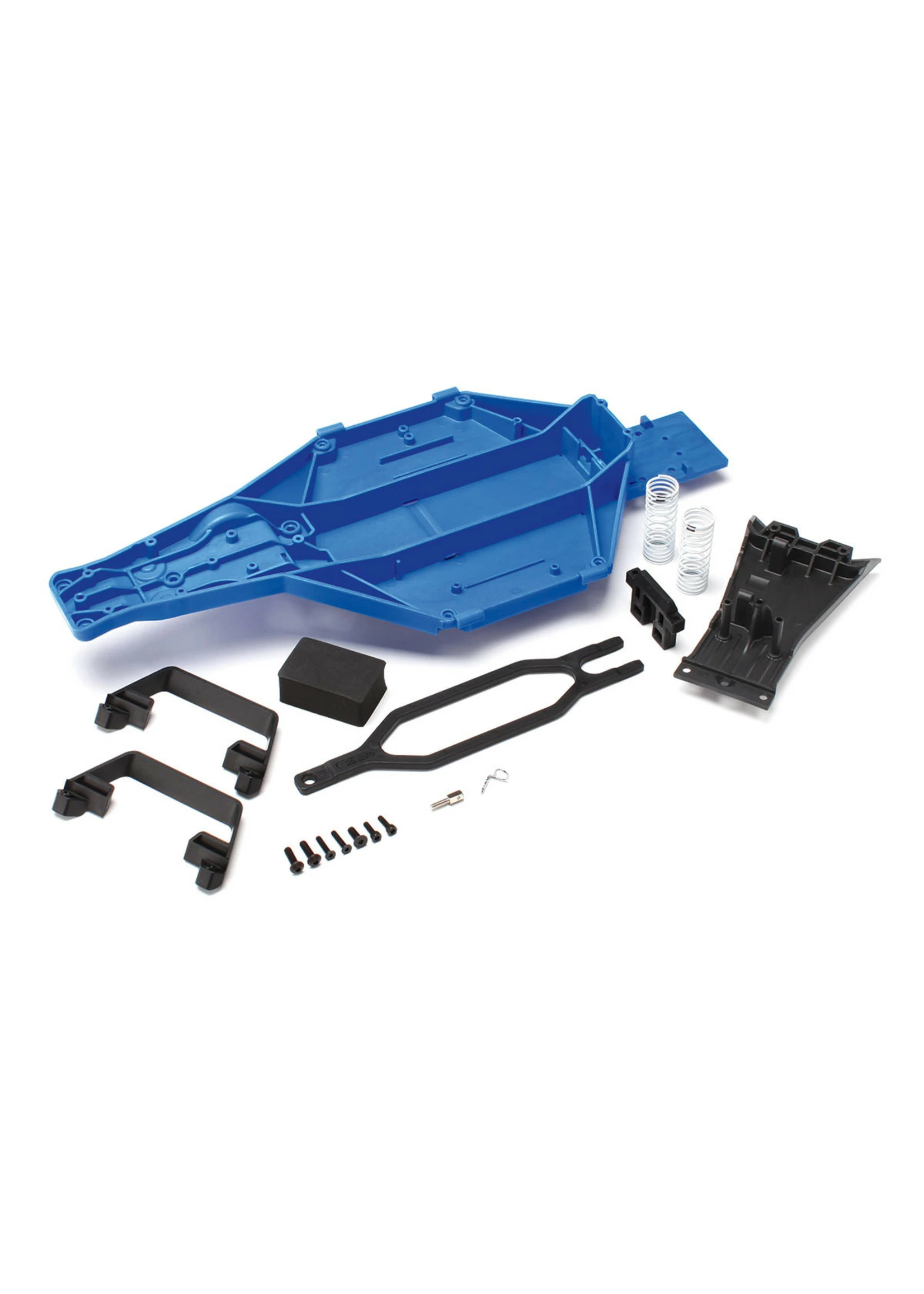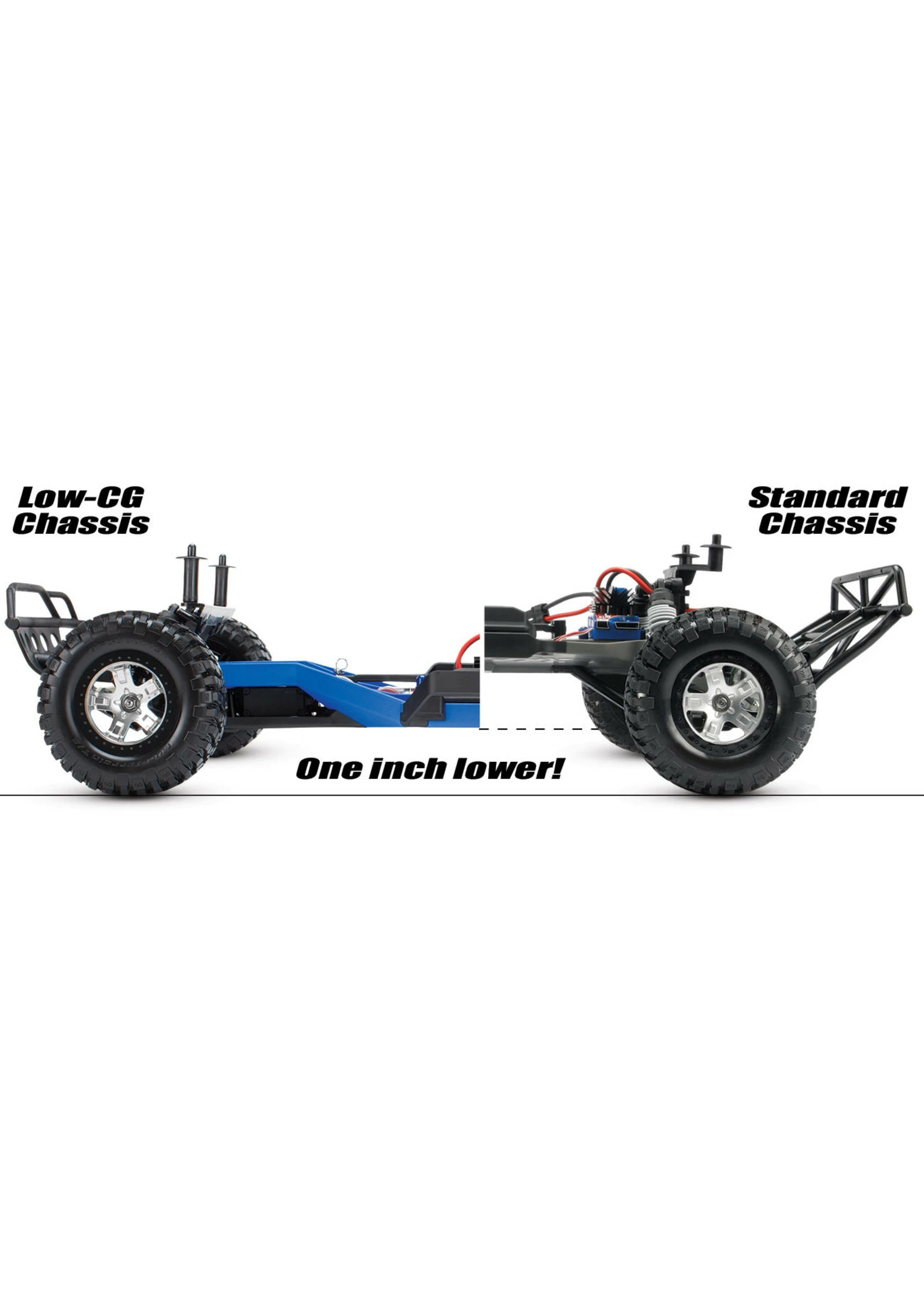 The Low-CG chassis holds the battery and electronics as deep in the chassis as possible to position weight low in the chassis. The low-CG design dramatically increases corner speed and stability no matter where you drive. The complete Low-CG Conversion Kit (#5830) includes a blue low-CG chassis, black nerf bars and lower chassis, battery hold down, optimized low-CG front shock springs (#4458), and hardware.