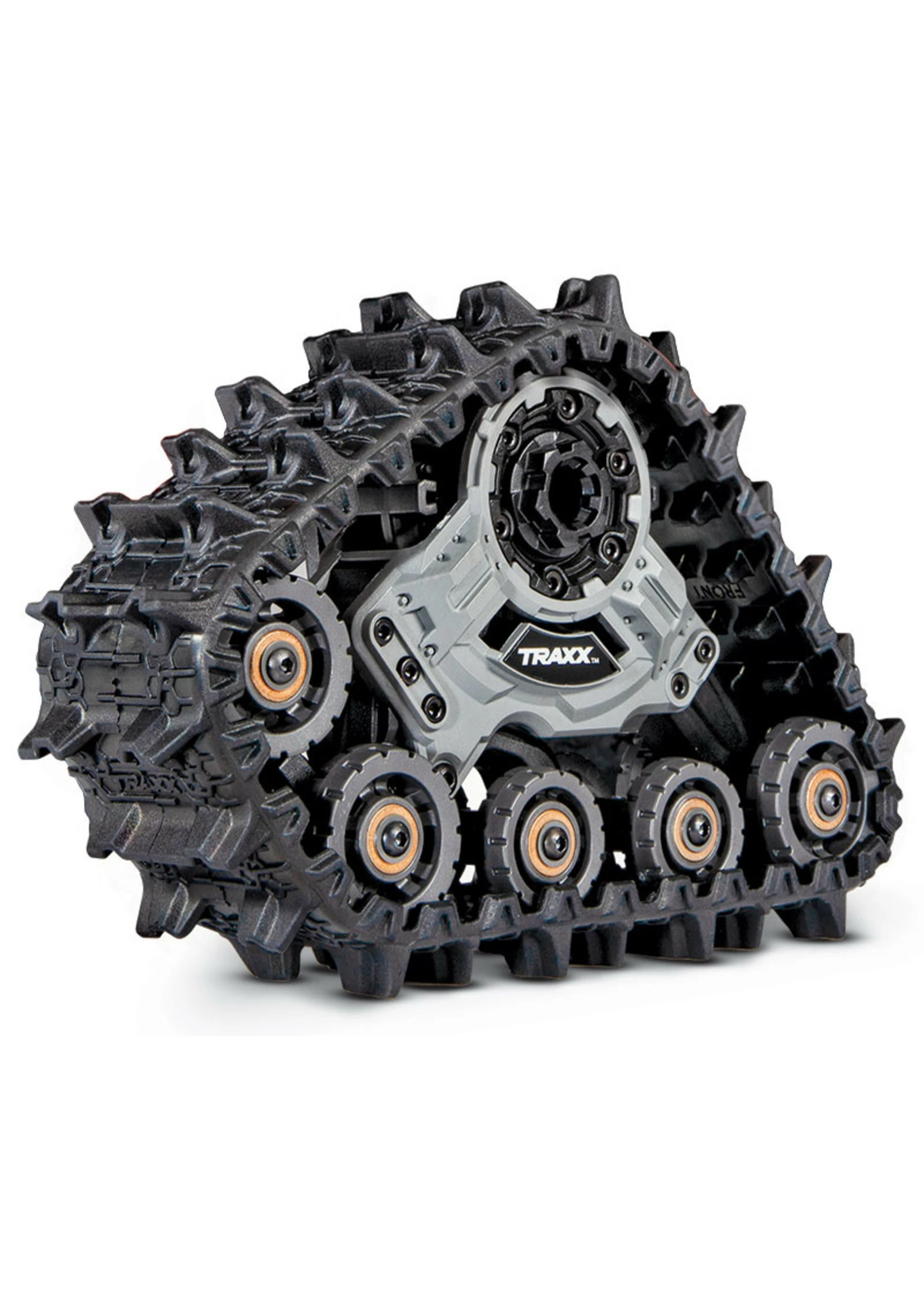 Each Traxx drive unit is engineered for rugged, yet smooth performance. An adjustable tension wheel keeps the treads tight while suspended road wheels allow the tread to conform to surface irregularities for maximum traction. Oil-filled dampers on each drive unit control rotational movements to help keep the tread glued to the surface. The rear Traxx drive units are longer to allow climbing steeper grades with authority.