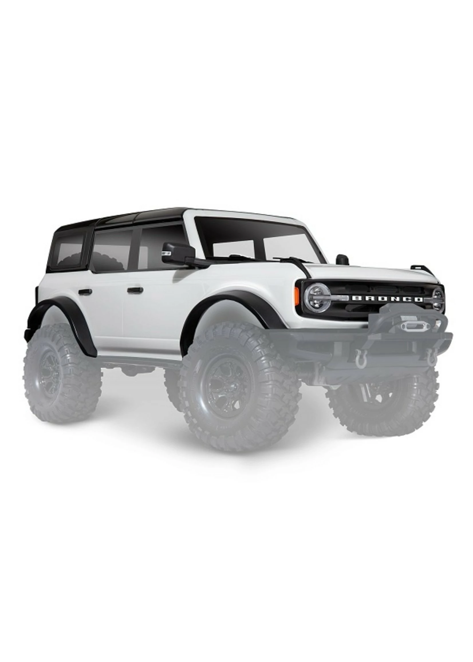 Includes: Body, Ford Bronco (2021), complete, Oxford White (painted) (includes grille, side mirrors, door handles, fender flares, windshield wipers, spare tire mount, & clipless mounting) (requires #8080X inner fenders)