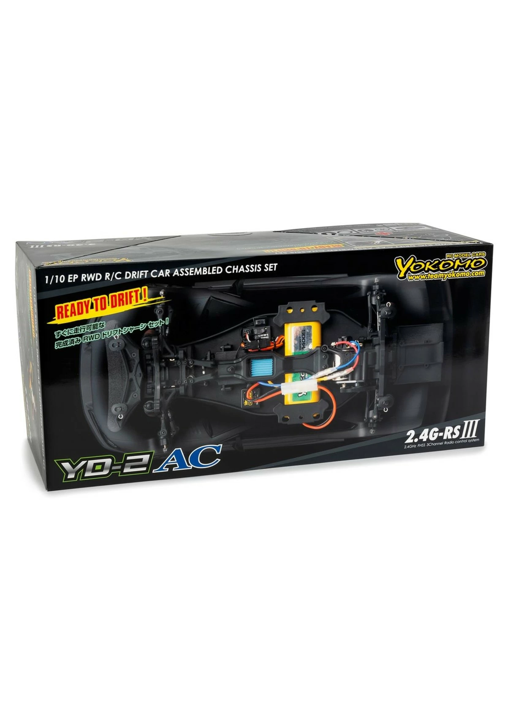 Yokomo YD-2AC “Ready To Drift” 1/10 2WD RWD Drift Car Kit is a 90% pre-built chassis. This kit includes the Yokomo SCR-BR speed control, 27 turn drift zero brushed motor, YG-302 gyro, 800-S servo, RSIII 2.4GHz transmitter and a 1400mAh NiCd battery with wall charger. You add the body, wheels and tires you prefer to complete the kit!